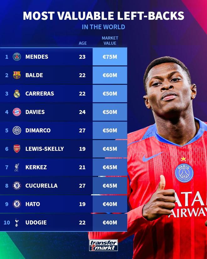 在完成最新一次身价更新后,德国转会市场网站列出世界足坛左后卫身价排行榜,巴黎后卫努诺-门德斯以7500万欧居首,巴萨后卫阿莱士-巴尔德以6000万欧位列第二。